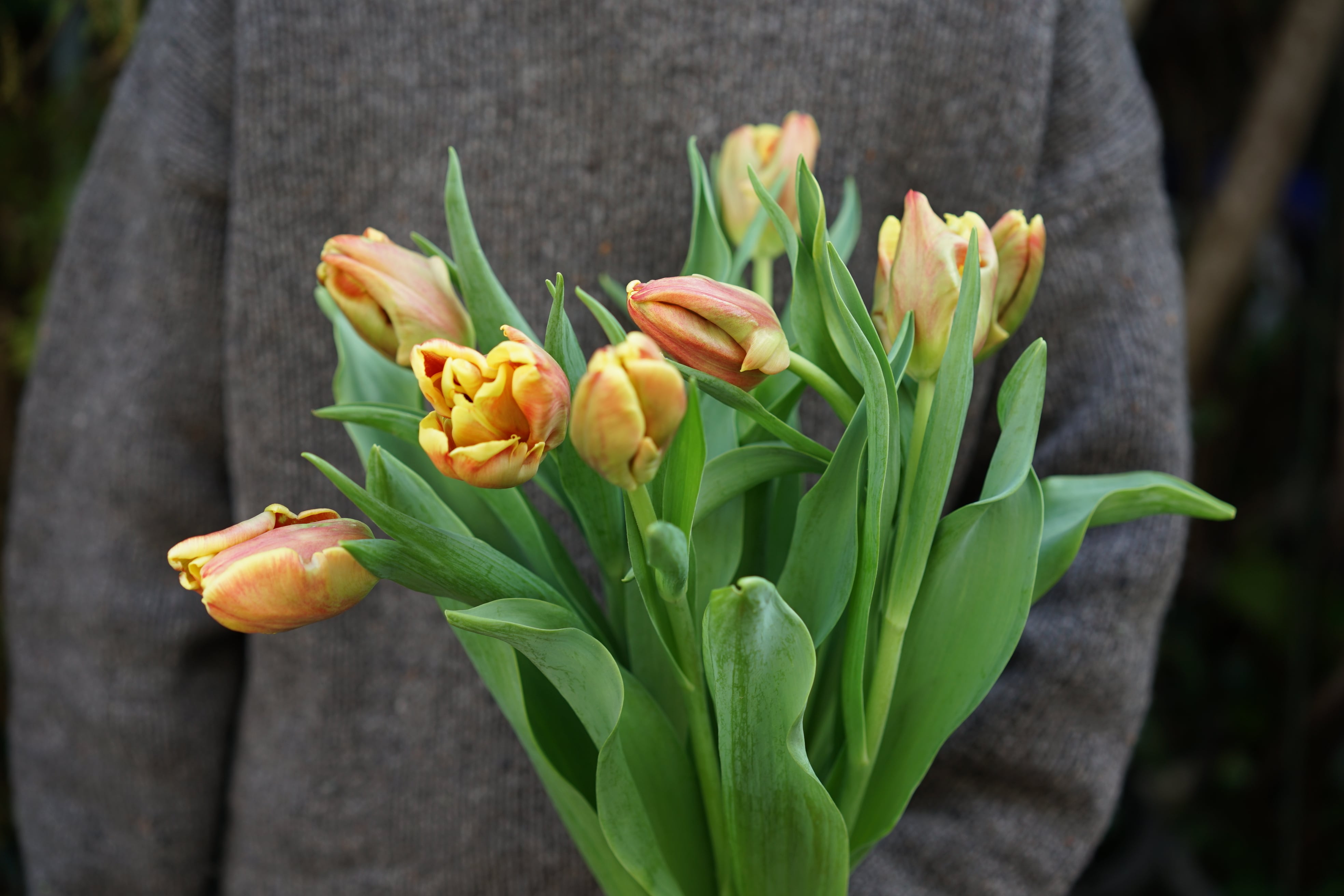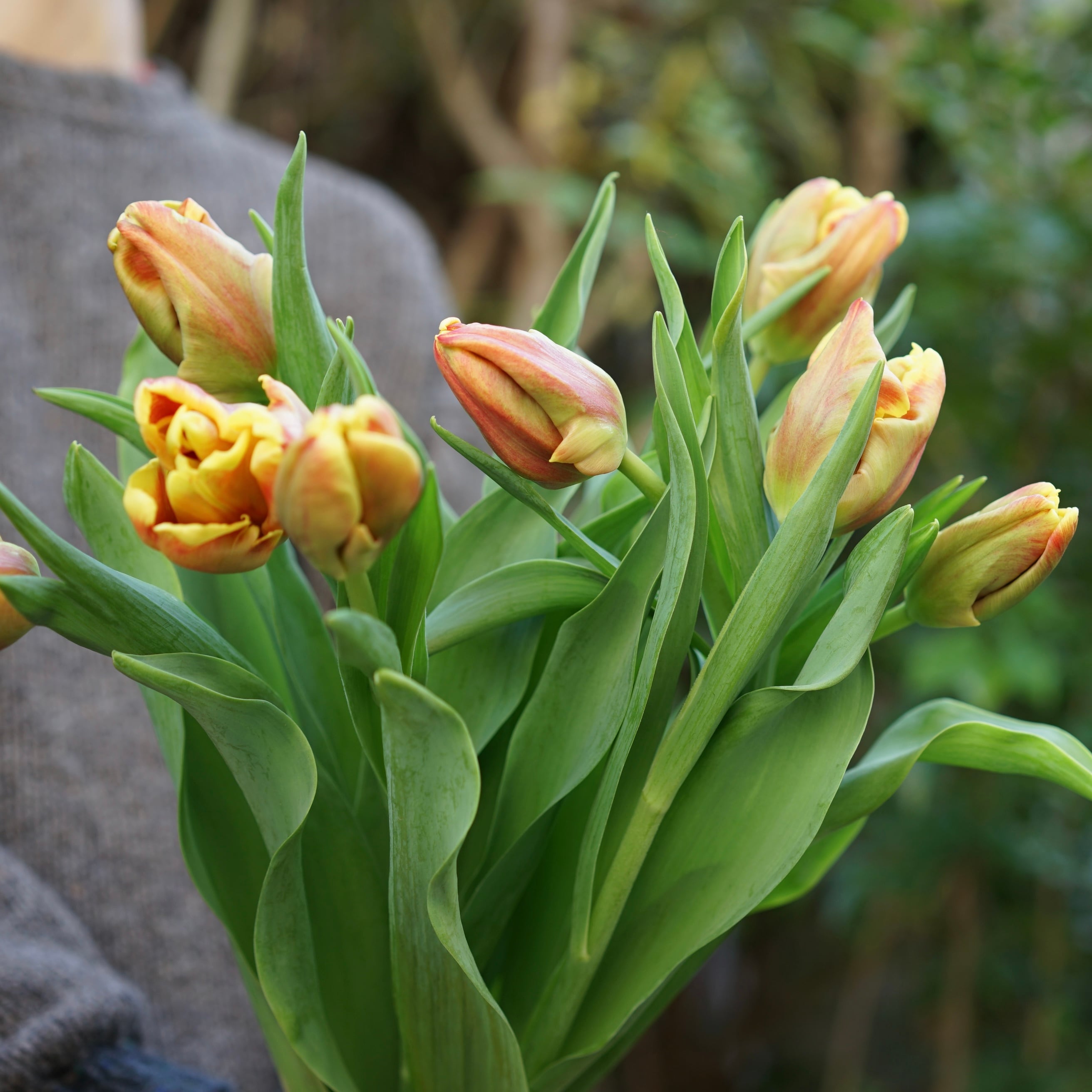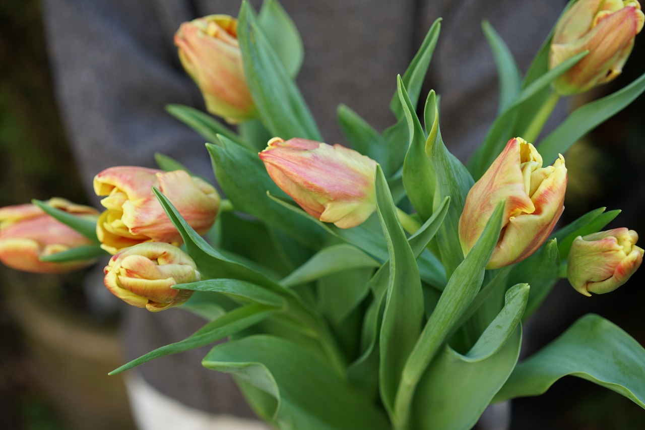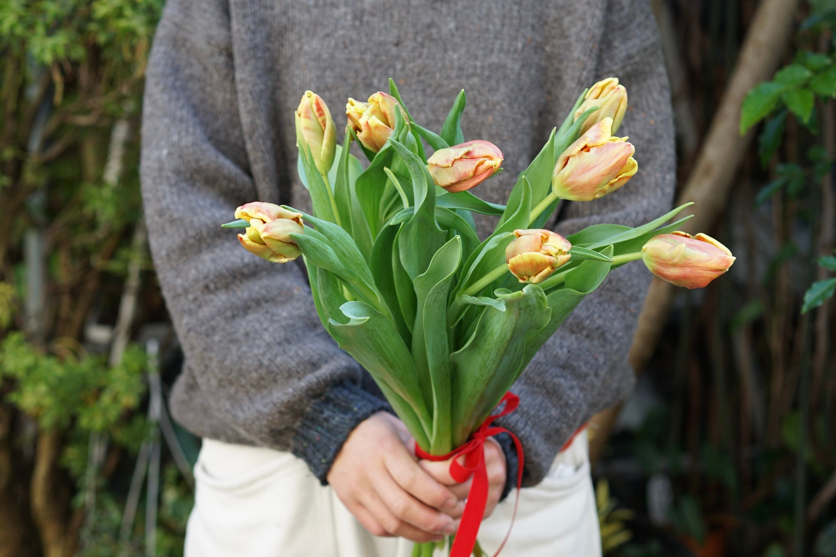 色や形や大きさも様々なたくさんのチューリップの中から、その日1番のとっておきのチューリップをブーケにしてお届けします。